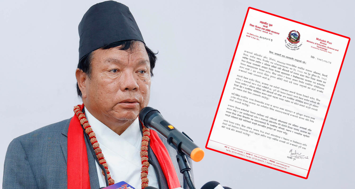 काठमाडौँ । शिक्षा, विज्ञान तथा प्रविधि मन्त्रालयले शिक्षक, प्राध्यापक र कर्मचारी राजनीतिक दलमा संलग्न भए कारबाही गर्ने चेतावनी दिएको छ । शिक्षा, विज्ञान तथा प्रविधि मन्त्री महावीर पुनले प्रचलित कानुनअनुसार पदबाट बर्खास्त गर्नेसम्मको कारबाही हुने चेतावनी दिएका हुन्।