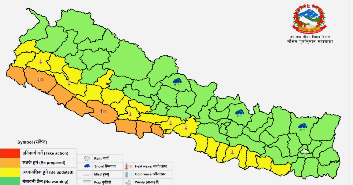 घरबाहिर निस्कँदा छाता, टोपी वा कपडाले टाउको ढाक्न सल्लाह छ । अहिले नेपालमा पश्चिमी र स्थानीय वायुको आंशिक प्रभाव छ । हिमाली भेगमा सहित कोशी प्रदेशका पहाडी भागमा आंशिक बादल लागेको छ, भने बाँकी भागमा मौसम सफा छ ।