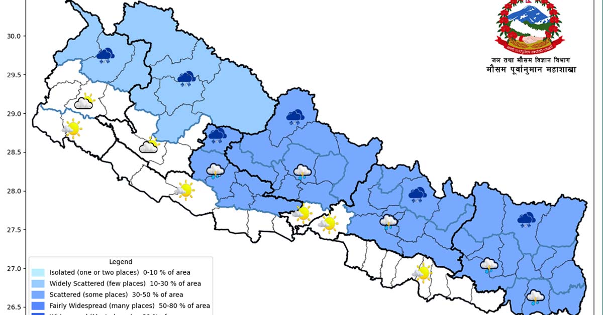 देशका हिमाली भू–भागमा साधारणतया बादल लाग्ने, पहाडी भू–भागमा आंशिक बादल लाग्ने र तराई भू–भागमा मौसम मुख्यतया सफा रहनेछ । कोशी, गण्डकी र कर्णाली प्रदेशको हिमाली भू–भागका एक–दुई स्थानमा हल्का वर्षा÷हिमपातको सम्भावना रहेको छ ।