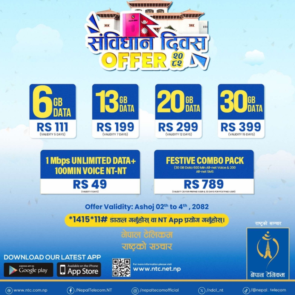 काठमाडौं, । नेपाल टेलिकमले संविधान दिवस २०८२ को अवसरमा ग्राहकहरूका लागि ‘संविधान दिवस अफर’ उपलब्ध गराएको छ ।