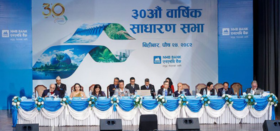 एनएमबि बैंक लिमिटेडले आफ्नो ३०औँ वार्षिक साधारण सभा बिहीबार सफलतापूर्वक सम्पन्न गरेको छ। काठमाडौंको टुँडिखेलस्थित त्रिभुवन आर्मी अफिसर्स क्लबमा आयोजित सभाले बैंक सञ्चालक समितिद्वारा प्रस्तावित लाभांशसहितका एजेन्डाहरू पारित गरेको हो।
