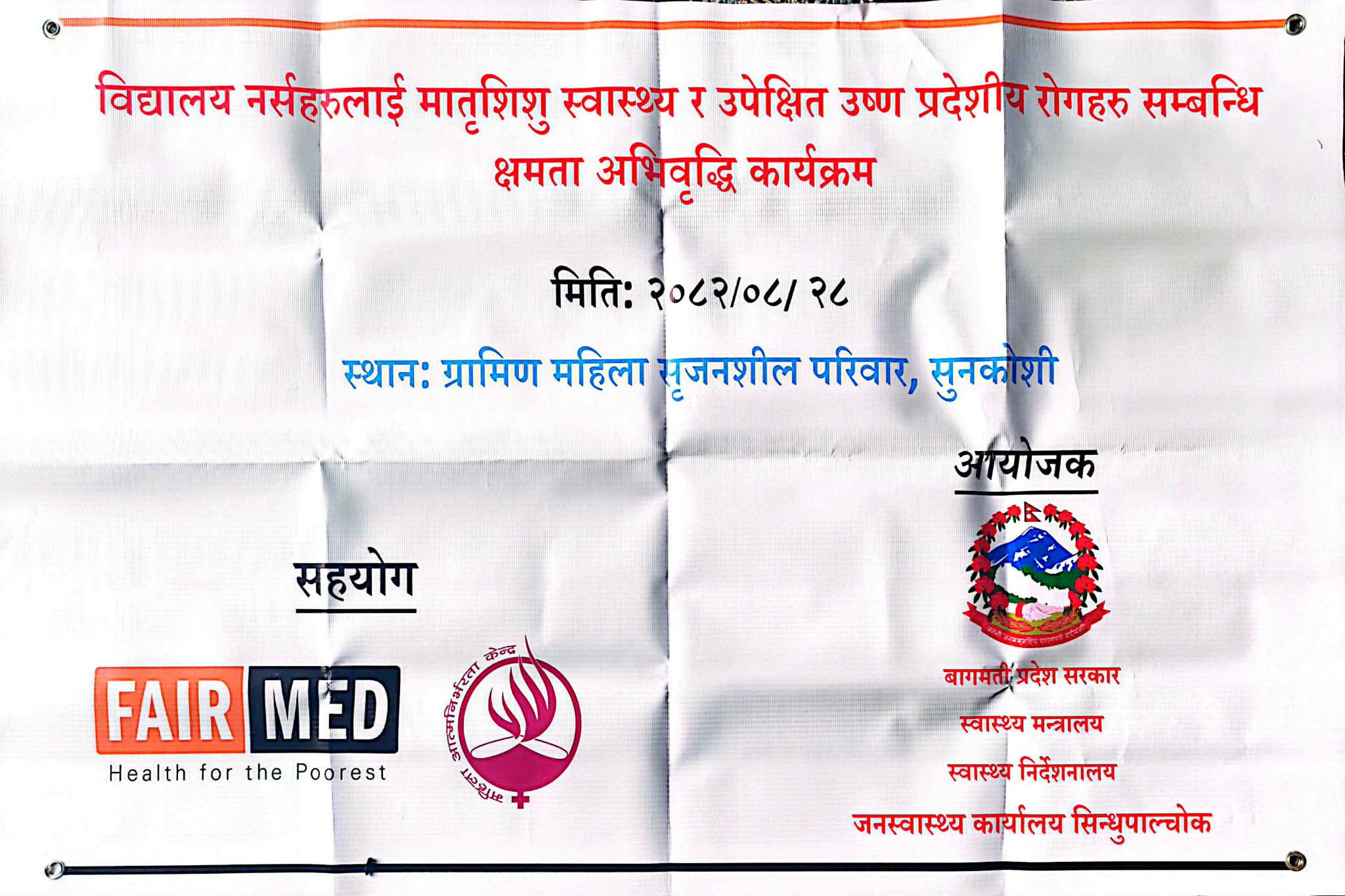 जनस्वास्थ्य कार्यालय सिन्धुपाल्चोकको आयोजना तथा फेयरमेड फाउन्डेसन र महिला आत्मनिर्भरता केन्द्रद्वारा संचालित सिन्धु स्वास्थ्य परियोजनाको सहयोगमा विद्यालय नर्सहरूका लागि मातृशिशु स्वास्थ्य तथा उपेक्षित उष्ण प्रदेशीय रोगसम्बन्धी क्षमता अभिवृद्धि कार्यक्रम हिजो मंसिर २८ गते (आइतबार) सम्पन्न भएको छ ।सुनकोशी गाँउपालिका स्थित ग्रामीण महिला सिर्जनशील परिवारको सभा हलमा भएको उक्त कार्यक्रमले विद्यालयमा अध्यनरत विद्यार्थी लगायतको स्वास्थ्य प्रवर्द्धनमा सहयोग पुग्ने अपेक्षा गरिएको आयोजकले जनाएको छ ।